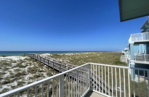 Beach front townhouse condominium located directly on the sugar white sands of Pensacola Beach. The PRIVATE BEACH is yards away from the beautiful waters of the Gulf of Mexico. Nothing beats the spectacular view and access our unit has to offer. The unit is only feet away from the swimming pool, tennis courts and next to the walk over to the PRIVATE beach. Imagine the first signs of the rising sun peeking through the shades. Open your eyes to the breathtaking view of the white beaches and aquamarine Gulf of Mexico. What a way to start your day! It's truly a 'home away from home.' Relax on our balcony and you just may see dolphins swimming and frolicking in the water.
