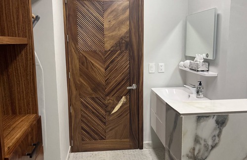 Bedroom #3 is a beautiful large bedroom also offering a full kitchen, living room, dining room, outdoor terrace with sunset and beach views. The large bedroom has one king-size bed and one Queen-size bed and a sofa bed. 65 inch smart TV and 2 air conditioners. With a cosy and private bathroom offering a shower and closet. The kitchen has a dining island ideal for breakfast or entertaining while meal preparations . Next to the kitchen is an outside terrace that provides unparalleled panoramic views of the ocean, forest, beach, sunrise, and sunsets. the kitchen also has purified bottle water, refrigerator, stove, oven and micro-wave, toaster, blender and all of the necessities for meal preparations.