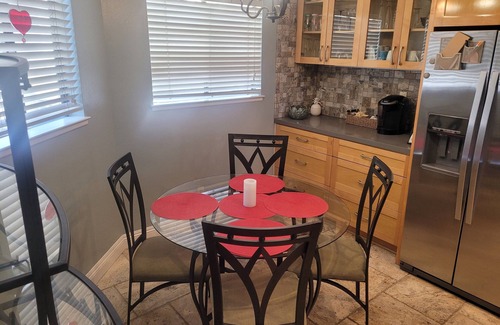 -Fully equipped eat-in kitchen, full-sized refrigerator, stove, oven, microwave, toaster and Keurig coffee machine.