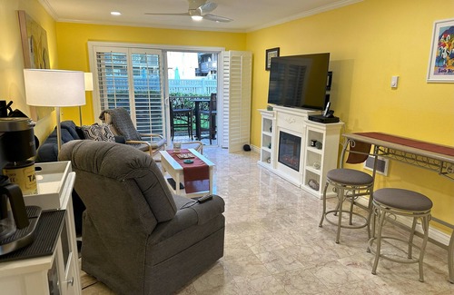 For the discriminating travel. 100 steps to the beach. If you are looking to feel pampered and surrounded by beautiful upscale decor, while enjoying a relaxing, beach vacation, you have found your vacation/travel/business home. This beautiful upscale 3-bedroom, 2 full-bath, ground-floor condo is tastefully decorated in Italian marble, granite, and travertine. The condo features include an electric fireplace, shutters, crown molding, and a private patio with a BBQ. We have your tech needs covered with 4 TVs, a DVR, silver cable service with 175 channels, 500 MBPS high-speed wifi, and internet. It is conveniently located right next to one of the two pools and spas. Our condo is unique in the comforts provided with you in mind. We've tailored our property to make your stay enjoyable and relaxing. Our attention to detail and your comfort will shine through every moment of your memorable stay.