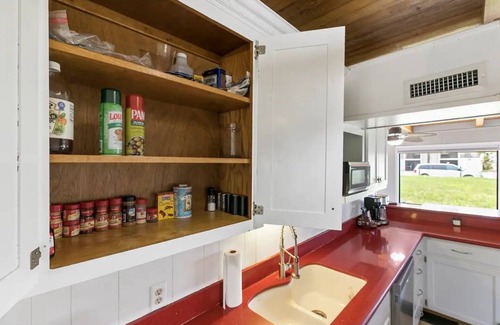 This retro house is a property our family calls the Beach Pit. It was one of the original beach houses on the Island and some of its original features remain; vaulted slat ceilings and black and white parquet floors. You will likely feel a mix of nostalgia contrasted by the comforts of modern day conveniences. Watch the world go by through the big bay windows, enjoy the beach wagon for time at the beach or hunker down and watch a movie. Dogs welcome at no extra charge, fully fenced yard.