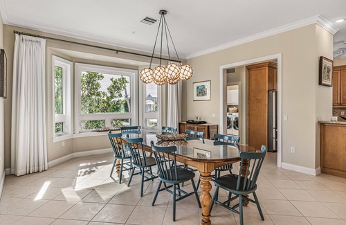 Master suite on the top floor has a king bed with panoramic views of the water and built-in desk space for remote working if you have to clock-in for a few hours. This suite also has a large bathroom that includes Jack & Jill sinks with large walk-in shower and a jetted Jacuzzi tub. Other bedrooms include a king, two queens and a pair of double beds for the kids.