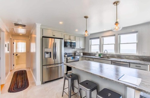 Pushing open the navy blue front door, you're greeted by breathtaking views as you step into the open concept kitchen and living room. Enjoy breakfast at the large center Island as you stare over Cape Cod Bay with views of Pilgrim Monument in the distance.Down the hallway, three bedrooms complete the sleeping arrangements in this sleeps 6 home. The first two bedrooms at the front of the home each have a king bed and beautiful built-in cabinetry. Further down the hall, the final bedroom houses two twin beds atop great built-in storage, and breathtaking views of the bay waters below.