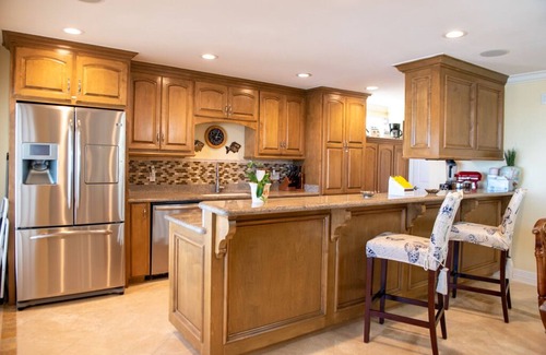 Get comfortable on the large leather sofas and rocker recliner as you enjoy watching a movie or TV on a flat screen TV. Enjoy reading a book from the extensive library as you take in the view of the floor to ceiling windows. The living room is accompanied by a 'kitchen with a view that hosts all stainless steel appliances and granite countertops. Dine inside or out. Upstairs there is dining for 10 inside, or a table for 6 outside on the out door patio. There Are TWO complete fully equipped kitchens. For the coffee lovers there is a Nespresso, Keurig, and a regular drip coffee maker. Take a short detour downstairs to the patio by the pool for an outdoor kitchen complete with two charcoal bbq grills and a gas grill. Second fully equipped kitchen located on ground floor with seating for 8, and additional living room.