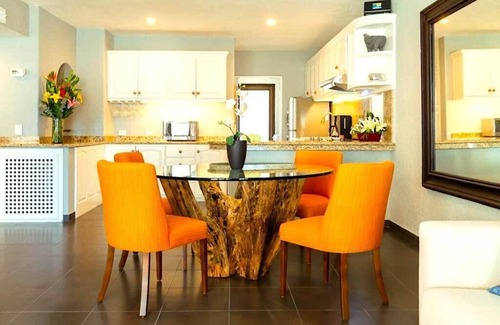 Our condo is modern, with splashes of Mexican decor and artwork. The open-plan layout provides lots of natural light. The kitchen has quality stainless steel appliances, a kitchen hood and everything needed to prepare meals at home. Plus the extras like a coffee maker, toaster, blender, and even a dishwasher! Enjoy your meals at the beautiful indoor dining table with a tree-trunk base and 4 plush chairs. The table makes a great laptop workspace, too!