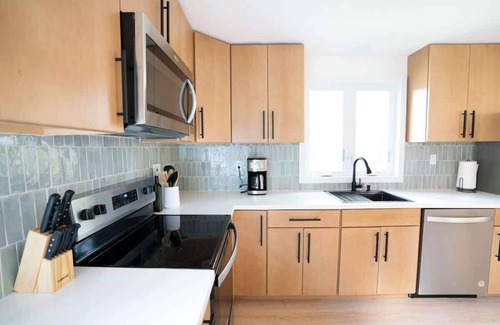 The open-concept living space ensures everyone stays connected, fostering a sense of togetherness throughout your stay. The fully equipped kitchen is a culinary delight, perfect for both seasoned chefs and hobbyists alike. With everything you need to whip up delicious meals, you'll find cooking a pleasure. If you prefer dining out, enjoy one of the many nearby restaurants and conveniently store your leftovers in the spacious fridge. The adjoining dining area features a chic table with seating for six, creating the perfect setting for shared meals and lively conversations. In the warmer months bring your meals outside and pass your plate around the outdoor patio table.