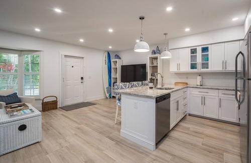 Our renovation is complete and WOW! Mostly everything in the apartment is new/nearly new. This light and airy space welcomes you with bleached oak plank tiles, fresh white paint, beautiful new bathroom and comfy coastal bedroom equipped with Plush King Mattress. New TV's, 55" in bedroom, 65" in living room. New stackable washer/dryer in bedroom for your convenience. Apartment has fully equipped kitchen, linens, towels, everything you need for your stay. Beach umbrella and 2 chairs provided for your use. Just bring your toothbrush & clothes! Our building is a private and hidden space with only 8 units. Lush landscapes and palms surrounds you. There is a grill in the courtyard patio for all to share as well as a table and benches.