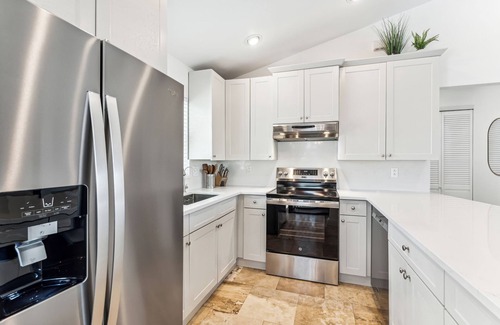- The kitchen is fully stocked with modern stainless steel appliances, ample dishes, pots, pans, and essential appliances such as a coffee maker (filters required), toaster, microwave, stove, refrigerator, dishwasher, and blender.