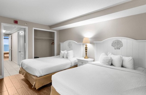 These 1BR/1BA oceanfront suites feature 2 queen beds, living room with a murphy bed -OR- sleeper sofa, dining area, kitchen, bathroom, and private balcony. These rooms start on the 3rd floor and go up to the 16th floor. The rooms are 506sq feet. All suites and balconies are non-smoking. Free Full Hot Breakfast every morning.