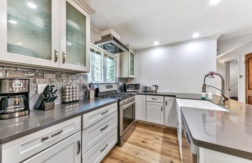 Recently remodeled, this South Lake Tahoe retreat now features beautiful hardwood floors and stylish furnishings designed to cater to every family's needs. The heart of the home is a fully updated kitchen, a culinary enthusiast's dream, equipped with modern stainless steel appliances, grey quartz countertops, and all the essentials needed to prepare delightful meals. The living area, anchored by a stunning 55" TV set above a stone gas fireplace, offers a cozy gathering space for families to unwind and enjoy movies or warm conversations. Each of the three bedrooms has been thoughtfully appointed to ensure comfort and restfulness, including two with luxurious king beds and a dedicated kids' room equipped with a twin bed and pull-out trundle, perfect for little adventurers.