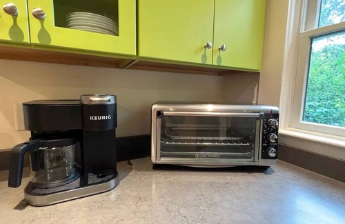 The house is L-shaped, with the kitchen at the heart. The north wing is the original house, built in the 1850s, with a dining room, living room, bathroom, and bedroom (1 queen) on the first floor. Through the living room and up the original spiral staircase you'll find two more bedrooms (1 queen and one with two XL twin beds), a bathroom with shower, and a sitting area. The west wing contains a bedroom (1 queen) and bathroom on the first floor, and two bedrooms (1 queen and one with two XL twin beds) on the second floor. The upper floors of the two wings are not connected. The large kitchen has high-end appliances, a breakfast island, and a laundry nook. The spacious and airy screened-in porch is off the kitchen and features a dining table and lounge area. There is an outdoor shower near the screened-in porch. The house is cooled with mini-split units and a few window units, and heated with radiant heat.