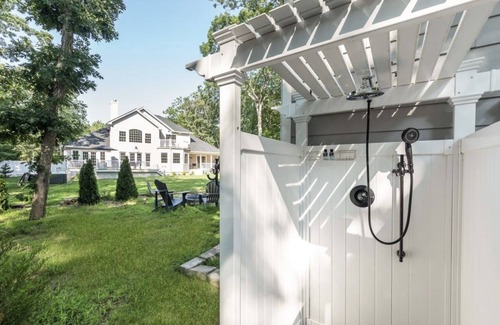 Welcome to this beautiful new home in the Clearwater Beach Community of East Hampton. This delightful vacation rental offers a tranquil and peaceful retreat for guests. The house is equipped with all the essentials you need will need for a relaxing stay, including washer, dryer, central AC, barbecue and brand new kitchen appliances. Enjoy cooking and dining in the beautiful kitchen with separate dining area and additional counter seating on the large granite island. Relax in the large living room with fireplace, flat screen TV and sonos sound system. French Doors from the living room lead to a large cedar deck with an amazing view of the expansive, fully fenced yard with firepit, lounge area, outdoor shower and fabulous 7 person hot tub with Bluetooth stereo. The first floor boasts a luxurious main bedroom with gorgeous ensuite and walk-in closet. French doors lead to a private deck with cozy gas fireplace with comfy seating. Also on the main floor is a large queen-sized bedroom with sliding doors leading to a private deck, and a full bathroom just steps away. On the second floor there are two additional bedrooms, a king-size bedroom with sliding doors that open to a balcony overlooking the property, perfect for an early morning coffee or evening cocktail. The second floor also includes a bright and peaceful queen-sized bedroom. There is a full bathroom on the second floor. All bedrooms are equipped with large, flat screen smart televisions. This property also boasts an additional private office/den area with hardwire connection and flat screen large TV. There is an attached two car garage as well as access to a dedicated EV charging connection. Just a short bike ride or stroll from the private Clearwater Beach with beach access, picnic tables, barbecue area, playground, and bocce court. Enjoy dinner, shopping and people watching in the village of East Hampton, just a short drive away or stay home and relax in this wonderful property.