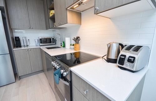 Minutes away from all highways, transit, and groceries with plenty of Uber Eats options. You will love your stay the second you walk into this spacious, new apartment with flawless finishes & a cool breezy design. There are two beds - a queen and a double, both fitted with comfortable mattresses for a great sleep. The apartment has 2 full bathrooms with all the essentials: towels, shampoos, soaps, tissues. The kitchen is stocked with all you may need to make a meal for the whole family. There is a balcony for lounging and a gym downstairs too!