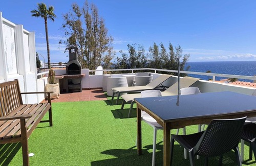 Duplex (2nd and 3rd floors) in a luxury residence on the 2nd sea line with equipped kitchen, 4 bedrooms, comfort with sea, garden and mountain views (El Teide). Possibility of walking tours (beach, shops, bars, restaurants, banks.