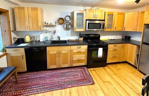 The full kitchen includes refrigerator, dishwasher, abundant counter and cupboard space, a lovely breakfast bar, microwave, french press coffee maker, blender, and many other extras.