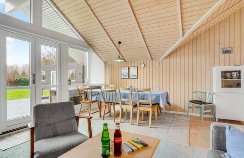 The house welcomes you to the south coast of Møn. Make yourself comfortable with the whole family in the bright, tastefully furnished rooms. Here you will find plenty of lovely places to relax alone or in company, and the classic summer house charm of the holiday home makes it easy to leave everyday life behind. Look forward to shared meals with a view of the garden through the large window front and end the day on the sofa with a game of cards.