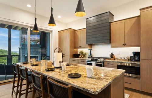 Camp Calico is a three-level homes boasting four suites. Retreat to the master suite on the top floor, a haven of tranquility, where you'll find a king bed, lavish en-suite bathroom complete with a walk-in shower, and dual vanities, and a private covered balcony. Marvel at the Blue Ridge Mountains while lounging on the daybed swing. The top floor also has a queen suite with step-in shower. The main floor is home to a second queen suite with a tub/shower combo. The final bedroom is located on the lower level and has a king bed with Jack-N-Jill bathroom.