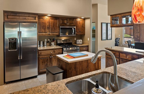 The open-concept living area features soaring 10’ ceilings, travertine floors, and grand red rock views. Comfortable leather couches surround a gas fireplace and flat-screen TV for relaxing and unwinding and a breakfast nook with a media area is ideal for sipping morning coffee made by either the drip coffee maker or a Keurig machine. The gourmet kitchen is a chef’s delight with beautiful knotty alder cabinets, granite counters, high-end stainless steel appliances, upscale kitchen amenities, and a formal dining room table for sharing meals with friends and family.