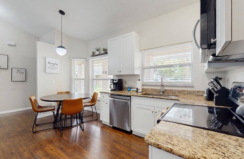 Inside, you'll find a fully equipped kitchen with all the amenities you need, including a fridge, stove, oven, dishwasher, microwave, coffee maker, and more. The living room is cozy and inviting, with comfortable sofas and a TV for entertainment. The house features multiple bedrooms with king, queen, and twin beds, ensuring a good night's sleep for everyone.