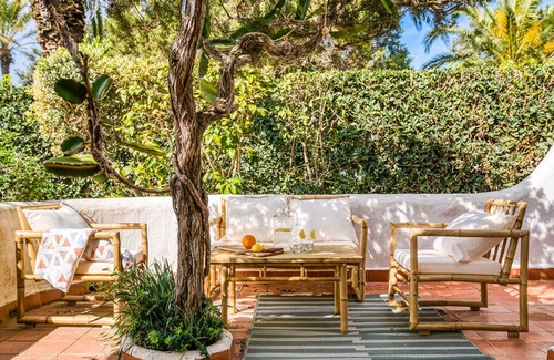 Inside, there are two double bedrooms and one single bedroom, each with views of the garden or terrace and air conditioning. Two bathrooms, one of which is en suite, complete the layout of the house.