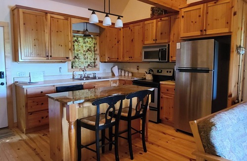 There is a primary bedroom, a loft sleeping area and a futon couch that folds out for additional guests. This cabin has real hardwood floors with lots of wood accents and a fully furnished kitchen to make meals.