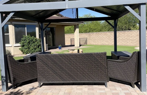 Conveniently located near I-10 and Davis Monthan AFB. This furnished home is situated in a quiet, well maintained neighborhood. The park and community pool is located right across the street with only a few steps to 'The Loop' Walking/ biking trail. Features 4 bedrooms and 2 bath, washer, dryer, and garage. After a long shift, relax with coffee or a glass of wine in the shade under the gazebo.