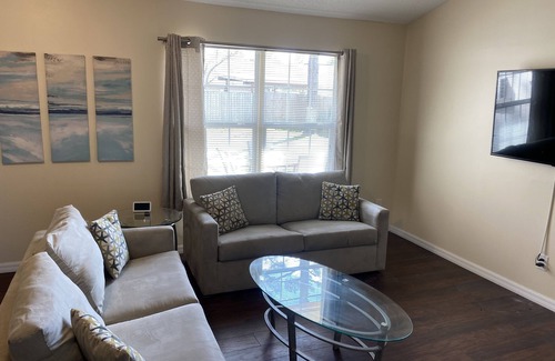 Recently renovated with over 2,000 sf in this spacious contemporary luxe ground level home. With an open format, (and no rugs) there’s space for everyone to gather or decompress after a long day of Orlando fun. The bedrooms do not share any adjoining walls adding privacy to the evening’s stay. The home is equipped with flat screens for streaming and Netflix. There is a sunroom for quiet reading or playing your favorite boardgames. The outdoor patio has seating for four to unwind or bbq, or enjoying the fresh Florida air. The large private backyard can easily accommodate a game of kickball or your guests’ gathering. The entire home is yours to enjoy except the closet in the first bedroom to the left. That is for housekeeping linens, disinfectants and cleaning supplies.