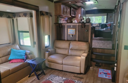 Comfortable 40 foot RV. Separate Bedroom with RV Queen. Living room with pullout full sleeper. Full RV kitchen. Bathroom with shower. TVs, and video or board games. Enjoy the summer at Payette Lake or Cascade Lake or Winter skiing at Brundage or Tamarack. 1 mile from Cascade Lake, 15 min from McCall. Fire pit and grill for outdoor picnics. Dog run and fencing for pets. Park like setting.