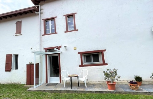 Gîte on the ground floor of the owners' house, on a working farm, on the heights of Espelette, at the foot of Mondarrain. Fitted kitchen (top fridge, microwave, induction/gas hob), living room, lounge (wood stove), 1 bedroom (1 double bed), shower room, wc, pantry (freezer, washing machine). Electric heating included, wood provided. Bed made on arrival. Rental of towels, household linen included. Wifi internet access. Parking, courtyard, terrace with garden furniture and barbecue. Donkey rides on site. Guided hikes from the gîte.