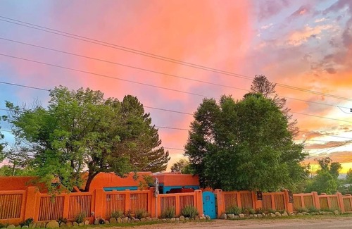 You will believe in miracles when you stay in this colorful compound. Between the historic Plaza and some of the best trailheads of Carson National Forest — you can walk to either! A 30-minute drive to either Ski Resort. This two-home compound has a seasonal stream, a chorus of birdsong, hammocks, a salt water hot tub, an outdoor shower, and PRIVACY. The compound includes the Star House main house, the Star Studio (a detached multi-use studio/ bunk house/ office), and the Moon House casita.