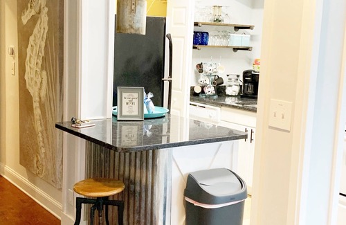 This perfectly located, south island, gated, with pool and fitness center, one bedroom one bath luxury condo comfortable sleeps four (4). Located near everything, the condo is two miles from the beach and Pier area. The master bedroom has a king bed with an expensive mattress and a remote controlled bed lift. Relax reading or watching TV/ Netflicks sitting up with the bed lift on the HD smart TV. The condo layout provides plenty of room for a queen pullout sofa. This condo is on the second floor with the inside all one level. It is very private and quite. There is a fully stocked, full sized kitchen and washer and dryer in the unit. Right from the HGTV Fixer Upper playbook, we have remodeled this condo and it is adorned in shiplap, stained ceiling beams, corrugated metal, granite countertops, walk in full tiled shower, hardwood floor. There is tons of natural light from all the windows and we added twelve can lights. The condo comes with free super hi speed wifi and a smart flat screen HD TV in the bedroom and in the living room. The centerpiece that divides the super large living room is a double sided fireplace. Shiplap coats the outside and one side is a remote controlled LED fireplace while the other is a non working traditional fireplace. Located in the Island Square condo community, the unit is approximately two miles from the beach, one and a half mile from the Pier area and within walking distance of tons of shops, a Winn Dixie grocery store, starbucks, restaurants and our famous Southern Soul BBQ. Biking or walking anywhere is definitely a good option. The private pool and fitness center are very close to the condo and is open year round. You won't be disappointed in this condo and it will enhance your vacation. Everything we do is designed to make your stay a relaxing experience. Accessing the condo is easy as we use coded door locks, so no keys to fool around with. We simply message you the code ten days prior to your check. If this condo is booked for your dates, never fear. We also have five other vacation rentals. Three on SSI and two in the mountains of SW Virginia. They are property numbers 3690215, 4041154, 4757544, 3595727 and 2675915. We are experienced vacation property owners/rental managers and have over ten years experience. We are confident that you will love our properties and want to return. We are a Preferred Partner with VRBO / Homeaway due to our quick response time, our highly rated and reviewed properties and for providing a high end guest stay experience. We try to be pet friendly and will consider allowing one dog only per stay but it must weigh less than 15 lbs and we must approve the pet prior to booking. The pet fee has to be paid. NOTE: if you bring a dog that has not been it will not be allowed inside.Thank you.