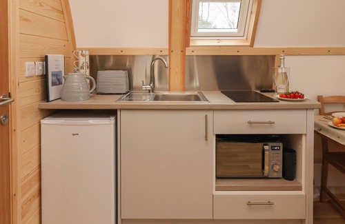 The living areas in this glamping pod consist of a studio-style layout with double bed, a kitchenette equipped with two hot plates, microwave, fridge with ice-box, toaster and kettle, a dining table for four and a sitting area with double sofa bed and TV. Outside there is parking available and a front gravelled area with barbecue, hot tub and picnic table. Within 4 miles there is a shop and 2.2 miles a pub. Sorry, no pets and no smoking. WiFi, fuel and power are all included in the price. Experience the countryside from Bevy. Note: There are two steps up into the property, please take care.