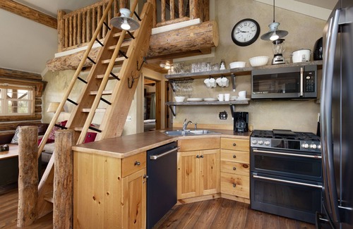 Cabin 15 Rustic is one of the few Cowboy Heaven Rental Cabins to offer a rare loft space and the high ceilings give this cabin a larger sense of space. Larger than the other cabins at 1,000 sq feet, this unit accommodates eight guests in bedrooms and a sleeping loft.