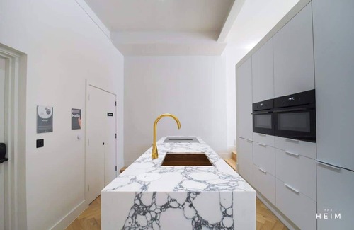 - State-of-the-art kitchen equipped with marble countertops, sleek white cabinetry, and gold finishes.