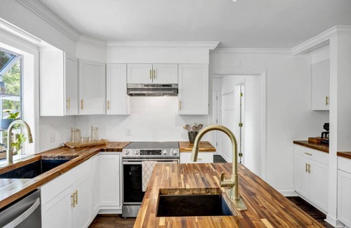 Fully stocked! Includes fridge, stove, microwave, toaster, Keurig Duo (some pods/tea/sugar provided), spices, cookware, dishware, and more.