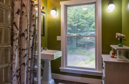 The downstairs full bathroom features a full-size tub for a relaxing bath after a day of hiking, the Epsom-salts will be here waiting for you. The upstairs full baths shower features walls of patterned glass brick for the ultimate light-flooded yet completely private shower experience.