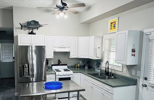 Linens & towels provided. Beach towels for an additional charge. Gas and charcoal grills, air fryer, microwave, kcup and pot coffee makers, coffee grinder, 2 blenders, nutribullet, mixer, can opener, toaster, electric griddle, steam pots, crock pots, first aid kit, fire extinguisher, 2 floor fans and ceiling fans in every room.