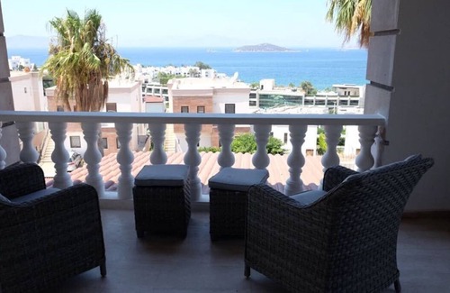 This luxurious villa is located in Turgutreis, Bodrum. There are beautiful views from several balconies throughout the 3 floors for you to sip your morning coffee and enjoy. The spacious villa allows for you travel with family and friends and still have your own space. The private pool and sunning area allows for relaxing all day long or you can walk to the beach and take a dip in the Aegean.