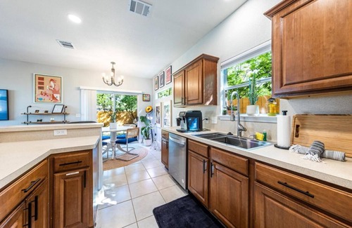 Step into this charming East Austin home, where convenience meets personality. Ideal for families, friends, remote workers, and more – this space welcomes a variety of guests and stays, whether short or long-term. Escape to a place that feels like the perfect vacation getaway, but offers all the cozy comforts of home. Enjoy local coffee shops, restaurants, hiking, and golf just minutes away! Sip morning coffee on the patio, entertain the kids (and dog) in the fenced yard, and whip up meals in the cheerful, fully-equipped kitchen. As you notice the lush houseplants throughout the house, it will be hard not to feel at ease. From quirky art to vintage treasures sourced locally and abroad, this home tells a story of native Austinites with a global spirit. Funky voice-activated lighting adds a modern touch, creating a space that's both playful and personal. Remote workers will love the dedicated workspace, complete with monitors and a printer. Evenings invite backyard BBQs under the café lights, a cozy movie night, or for those feeling adventurous, exploring the hip restaurants and bars East Austin has to offer – all within easy reach! Explore the neighborhood's vibrant nightlife nearby, or stay nestled away in this quiet space to unwind with amenities that cater to a wide array of personalities! It may just be your home base for exploring Austin's best. Ready to make those memories?