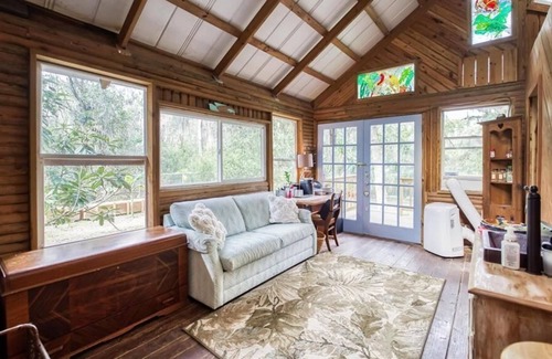 Nature is your neighbor at the funky cool "Love Nest" tiny cottage on the grounds of The Love Lodge. Adjacent to the open-air shared pavilion for yoga or gathering. Near famed mountain biking trails at The Alafia River State Park, canoeing, hiking, and the nearby Lithia Springs. The living area converts for a peaceful rest on a comfortable Lazy-Boy queen sleeper plus a queen aero bed in the upper loft accessible by ladder. Beautiful newly renovated bathroom in a rustic Bohemian style.