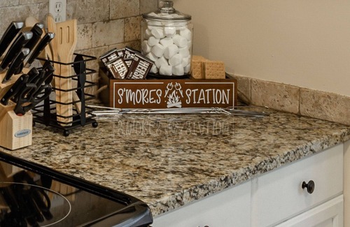 The kitchen is fully supplied with a Refrigerator, Electric Stove/Range, and dishwasher along with all the kitchenette necessary to cook home meals to serve the whole family. We want you to feel at home so we supply the first S’more supplies needed. Additional to the kitchen , the home is equipped with a Washer and Dryer and two pods for clothes washing.