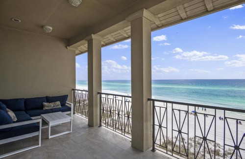 DETAILS: Le Neptune is a Gulf-front 5-bedroom, 4-bathroom Miramar Beach townhome that sleeps 15 in luxurious comfort. Guests will love the expansive beach views from 3 balconies, dedicated beach access, a private sitting spa, and beautiful interiors.