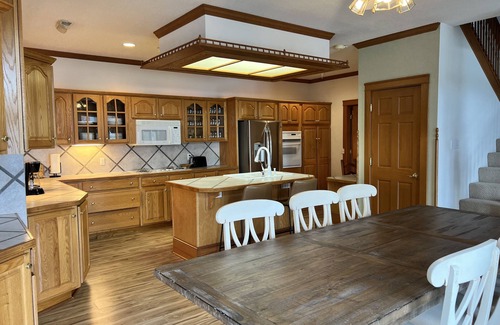 Enjoy mealtime or relaxing on multiple patios with 2 outdoor dining tables, fire pit, and adirondack chairs. Gas grill located right outside the kitchen.