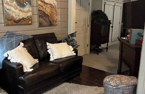 RELAX - COME ENJOY Texas hospitality at its best. THE Bow-wood suite is a romantic space, in an old 1927 remodeled ‘catalog’ Bungalow (we think a Sears Roebuck)with king, comfortable bed, with a smart TV in bedroom also. In sitting area, there is a Fireplace, recliner, smart TV, and makeup area. Large private bathroom with spa like shower unit. Included for our guests to enjoy are continental breakfast fixings, candies and miscellaneous snacks/goodies. Plus, washer/dryer available in ‘common area’, plus extra 1/2 bath, kitchenette with full size refrigerator and a comfy living room area for our guest to enjoy (particularly if they have guests, they won’t have to visit in their suite!). Old fashioned front porch seating for your morning coffee or maybe a nice glass of wine in the evening, or if you prefer - a gazebo in the back courtyard area to enjoy. We are located near downtown, so within walking distance to restruants, drug store, multiple churches, breweries, etc.