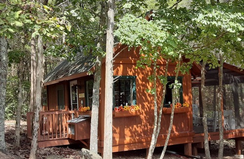 Our cottage has a retro feel , filled with nostalgia, games, and records. It is nestled in the trees, on the side of our log cabin, by a wet weather creek and close to our sweet goats. It has a sleeper sofa with a queen bed and a loft with a queen bed as well. There is a nice family room, small kitchenette with sink/microwave/refrigerator/ Keurig coffee maker /toaster, breakfast bar and stools, large bathroom with shower, and extra large screened in deck with a hot tub.