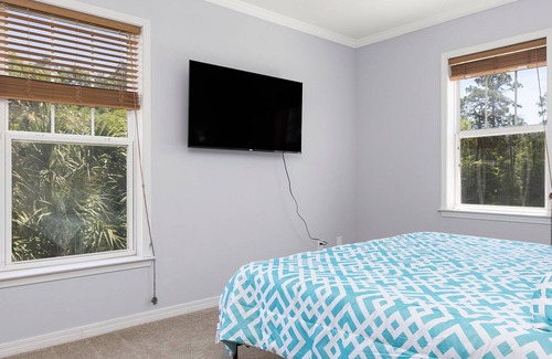 The main bedroom is very spacious featuring a king bed and a triple stacked bunkbed, with private bathroom, including double sinks and tiled walk in shower. The first guest bedroom features a queen bed and 2 sets of triple stacked bunkbeds. The second guest bedroom features a king bed. The two guest bedrooms share a bathroom with tub/shower. With its pet-friendly policy, the lodge is perfect for those who want to bring their furry friends along for the trip. *This home is pet(dog) friendly. 25 lbs. maximum. Fees and management approval apply. *