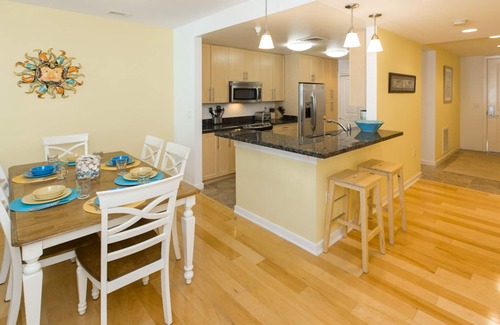 From the moment you step into Oceans Five, a bright and cheerful condominium, you'll feel your cares drift away. The open floor plan creates a welcoming and spacious environment, perfect for the whole family to gather. The living area offers ample comfortable seating, making it the ideal spot to share stories from the day, plan tomorrow’s adventures, or simply relax while watching your favorite movie on the large smart HD TV. Step through the sliding glass doors onto the private balcony, where you can unwind to the lively sounds of the courtyard pool and the beach beyond. It's the perfect place for your morning coffee or an evening cocktail to relax and recharge.