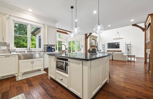 Discover elegance in our expansive custom-built retreat, comfortably hosting 16+ guests. Thoughtfully designed with furnishings primarily from RH, our home boasts a plush main-level master suite, and a separate studio apartment with its own kitchen. 2 grand living spaces and dining rooms ensure ample room for gatherings, while the kids can delve into our arcade games. Relish alfresco dining on our deck or warm up by the firepit. For movie buffs, a dedicated theater room awaits