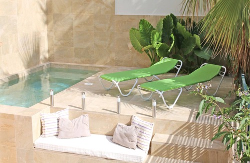 As a stylish and charming oasis with original, very high quality and artistic amenities, the house CA SES NINES is situated in a very quiet side street on the outskirts of the popular and traditional village of Selva at the foot of the Tramuntana. From clad with precious slates entrance area you reach the first and ground floor one bedroom with two single beds. In the hallway there is a bathroom with modern shower and the stairs in the rustic vaulted cellar with large dining table and adjoining laundry. The hallway leading from the upstairs stairway is open plan and without handrails. Furthermore the ground floor is the open plan living area with a German satellite TV and internet access to the dining area and a tasteful and fully equipped kitchen adjoins. From here you get to the covered terrace and into the courtyard, where a steinvertäfelter small pool area for refreshment and relaxation ensures on hot days.