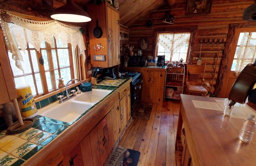 One bedroom has a full-size bed, one has a queen-size bed and there is a loft with a twin bed and a twin trundle. There is one full bathroom with a shower and a 1890s clawfoot bathtub. Also included is a full kitchen with all the basic cookware, even a waffle iron, and a microwave, but no dishwasher. This cabin has a Tv with a DvD/VcR player for watching movies, no cable. Books, toys and games are provided for the kids. It has both a wood-burning and a gas log fireplace. Propane grill included. For winter guests, chains and/or a 4Wheel Drive vehicle is Required. The cabin is 2.75 miles up a rocky, uneven, dirt mountain road. It has High Speed WiFi access but no satellite TV. The High Speed WiFi makes it a good choice for those who work remotely. No trailer parking. No Washer/Dryer. This property has a total of 850 square feet. Well water contains a high mineral content and is not advisable to drink. Water from the city tap is provided for consumption.